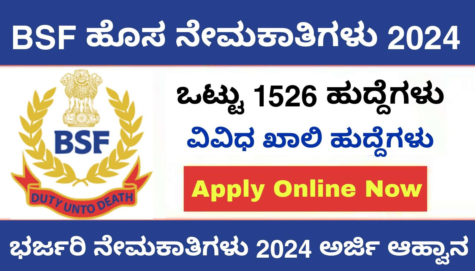 ನಮಸ್ಕಾರ ಸ್ನೇಹಿತರೆ ಬಾರ್ಡರ್ ಸೆಕ್ಯೂರಿಟಿ ಫೋರ್ಸ್ ಬಿಎಸ್ಎಫ್ ಇತ್ತೀಚಿಗೆ ವಿವಿಧ ಹುದ್ದೆಗಳಿಗೆ ನೇಮಕಾತಿಯನ್ನು ಮಾಡಲು ತನ್ನ ಅಧಿಕೃತ ಅಧಿಸೂಚನೆಯನ್ನು ಬಿಡುಗಡೆ ಮಾಡಿರುತ್ತದೆ. ಒಟ್ಟು 1526 ಖಾಲಿ ಹುದ್ದೆಗಳಿಗೆ ಆನ್ಲೈನ್ ಮೂಲಕ ಅರ್ಜಿ ಸಲ್ಲಿಸಲು ಅವಕಾಶ ನೀಡಲಾಗಿದೆ. ಆಸಕ್ತ ಅಭ್ಯರ್ಥಿಗಳು ಕೊನೆಯ ದಿನಾಂಕದ ಮುನ್ನ ತಮ್ಮ ಅರ್ಜಿಯನ್ನು ಸಲ್ಲಿಸಬಹುದಾಗಿದೆ. ಈ ಲೇಖನದಲ್ಲಿ ನಾವು ಬಿಎಸ್ಎಫ್ ಹೊಸ ನೇಮಕಾತಿಗೆ ಅರ್ಜಿ ಸಲ್ಲಿಸಲು ಬೇಕಾಗಿರುವ ಶೈಕ್ಷಣಿಕ ಅರ್ಹತೆ, ವಯಸ್ಸಿನ ಮಿತಿ, ಅರ್ಜಿ ಸಲ್ಲಿಸುವ ರೀತಿ ಮುಂತಾದ ಎಲ್ಲಾ ಮಾಹಿತಿಗಳನ್ನು ಸಂಕ್ಷಿಪ್ತವಾಗಿ ತಿಳಿಸುತ್ತೇವೆ ಆದ್ದರಿಂದ ಈ ಲೇಖನವನ್ನು ಕೊನೆಯವರೆಗೆ ಓದಿ.