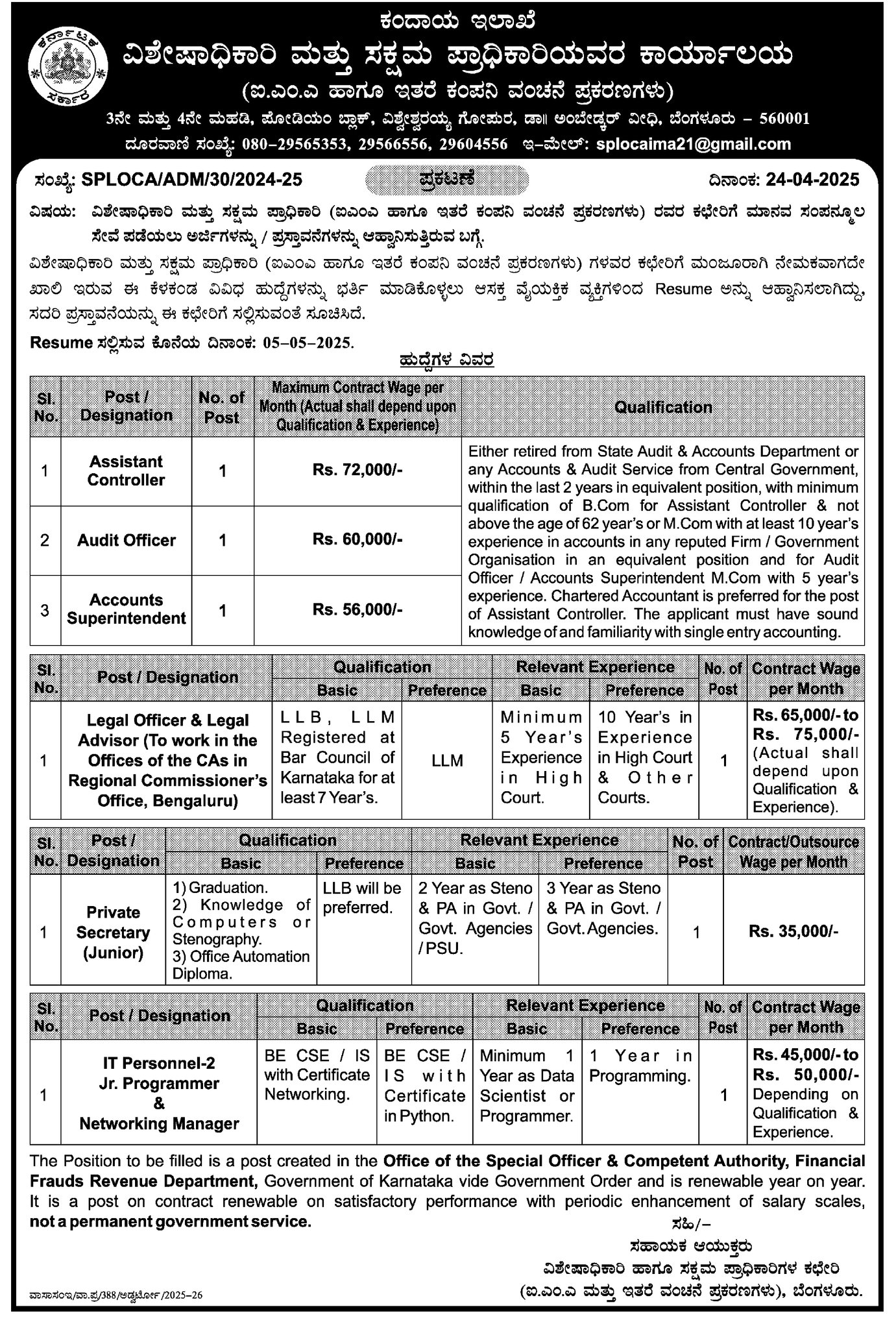 - ಪೋಸ್ಟ್ ಕಳಿಸಿಕೊಡಬೇಕಾದ ವಿಳಾಸ ವಿಶೇಷ ಅಧಿಕಾರಿ ಮತ್ತು ಸಕ್ಷಮ ಪ್ರಾಧಿಕಾರ ಕಚೇರಿ ಮೂರನೇ ಮತ್ತು ನಾಲ್ಕನೇ ಮಹಡಿ ವಿಶ್ವೇಶ್ವರಯ್ಯ ತವರು ಬೆಂಗಳೂರು 56001 ಈ ವಿಳಾಸಕ್ಕೆ ಮೇ 5 ರ ಮೊದಲು ಪೋಸ್ಟ್ ಮೂಲಕ ಕಳುಹಿಸಿಕೊಡಬೇಕು.
