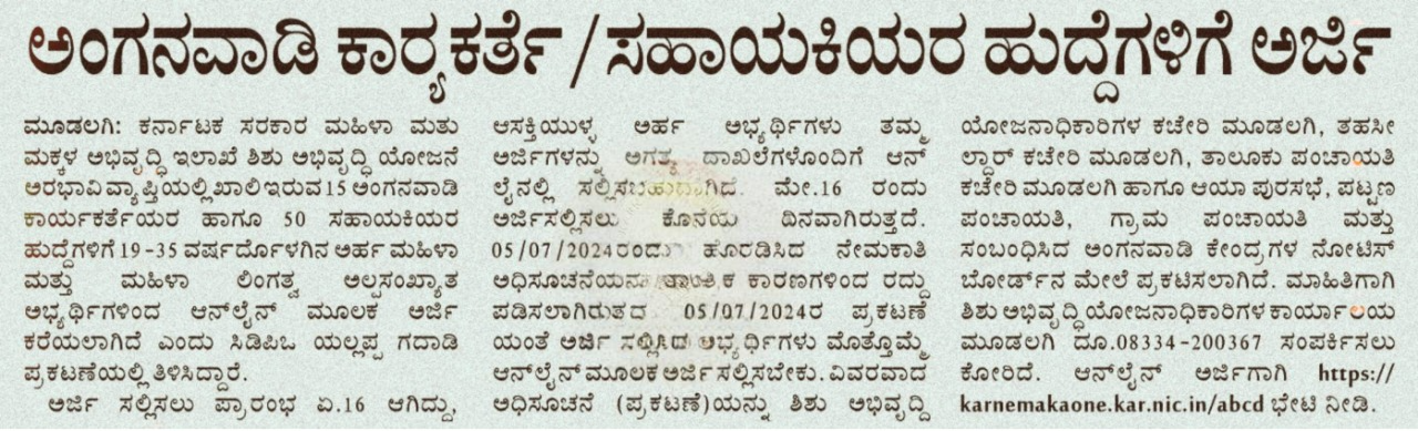 - ಮೊದಲಿಗೆ ಅಭ್ಯರ್ಥಿಗಳು ಮಹಿಳಾ ಮತ್ತು ಮಕ್ಕಳ ಅಭಿವೃದ್ಧಿ ಇಲಾಖೆ ಬಿಡುಗಡೆ ಮಾಡಿರುವ ಅಧಿಕೃತ ಅಧಿಸೂಚನೆಯನ್ನು ಡೌನ್ಲೋಡ್ ಮಾಡಿ ಸಂಪೂರ್ಣ ಓದಬೇಕು.